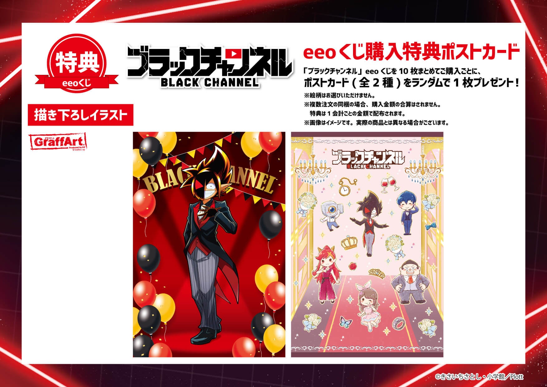 ポストカードのイラストはPlott新規描き下ろしのブラック、そしてGraffArtで描かれた『ブラックチャンネル』のキャラクターたちが大集合したものの2種類。「eeoくじ」を購入した記念として、ゲットしてはいかがでしょうか?