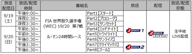 また、PC、スマホ、タブレット、 スマートテレビで視聴できる動画配信サービス 「J SPORTSオンデマンド」※3 では、「ル・マン24時間レース」、 「富士SUPER TEC 24時間レース」、 「スパ・フランコルシャン24時間レース」3戦の模様をスタートからゴールまで完全LIVE配信いたします。完全LIVE配信を通じて耐久レースならではの人と車が限界に挑む情熱と感動の全てをモータースポーツファンのみなさまにお届けいたしますのでぜひご期待ください。