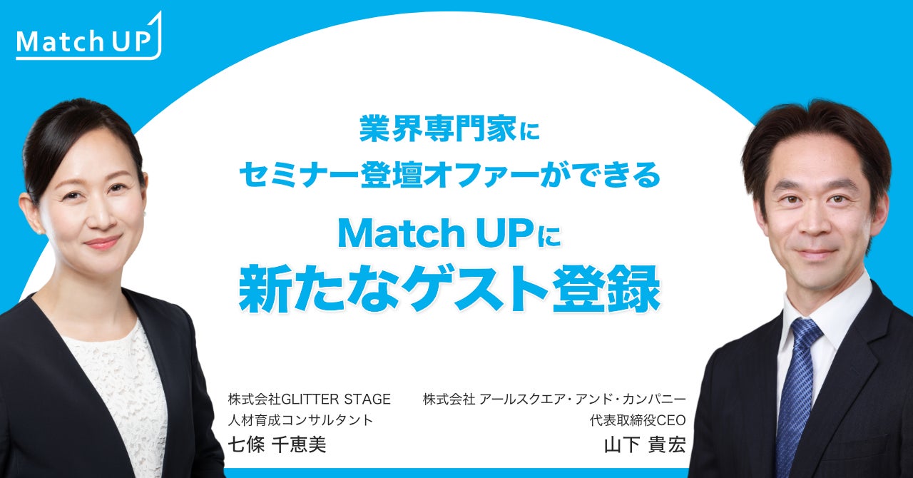 業界専門家にセミナー/イベント登壇のオファーができる「Match UP」株式会社GLITTER STAGEの七條千恵美氏、株式会社アールスクエア・アンド・カンパニーの山下貴宏氏などが新たにゲスト登録!