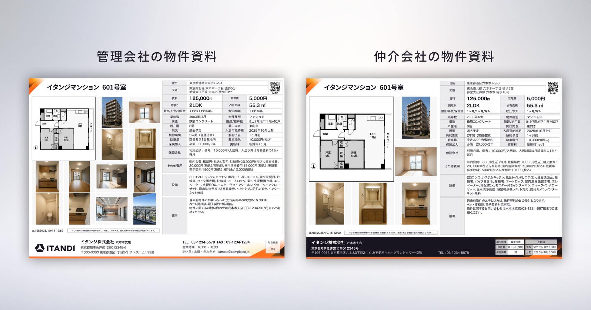 本機能の全物件への対応に先立ち、2025年10月には物件一覧画面に「物件資料」のボタンを追加。物件詳細画面に遷移せずに物件資料を作成できるようにし、利便性の向上を進めてきました。今回のアップデートによって、「ITANDI BB」に掲載されている全ての物件を対象に、仲介会社は登録されている物件写真や間取り図などの点数にあわせ適切なレイアウトを選択し、統一感のあるフォーマットで物件資料を自動作成することが可能になります。