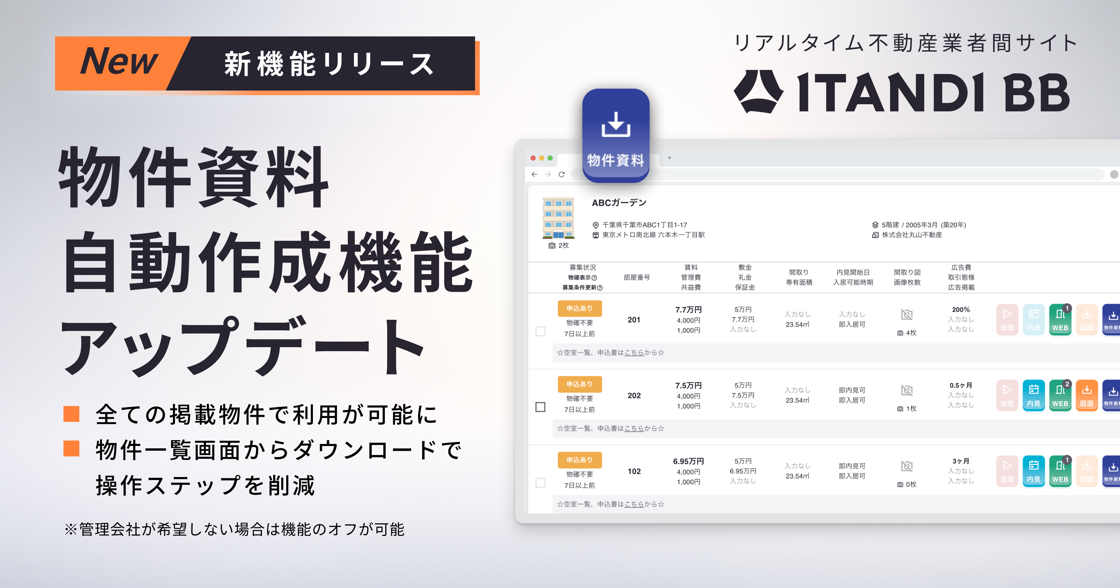 テクノロジーで不動産取引をなめらかにするイタンジ株式会社(以下「当社」)は、2025年11月10日より、リアルタイム不動産業者間サイト「ITANDI BB」の物件資料自動作成機能が、全掲載物件を対象に利用が可能(管理会社が希望しない場合は機能のオフが可能)になったことをお知らせします。
