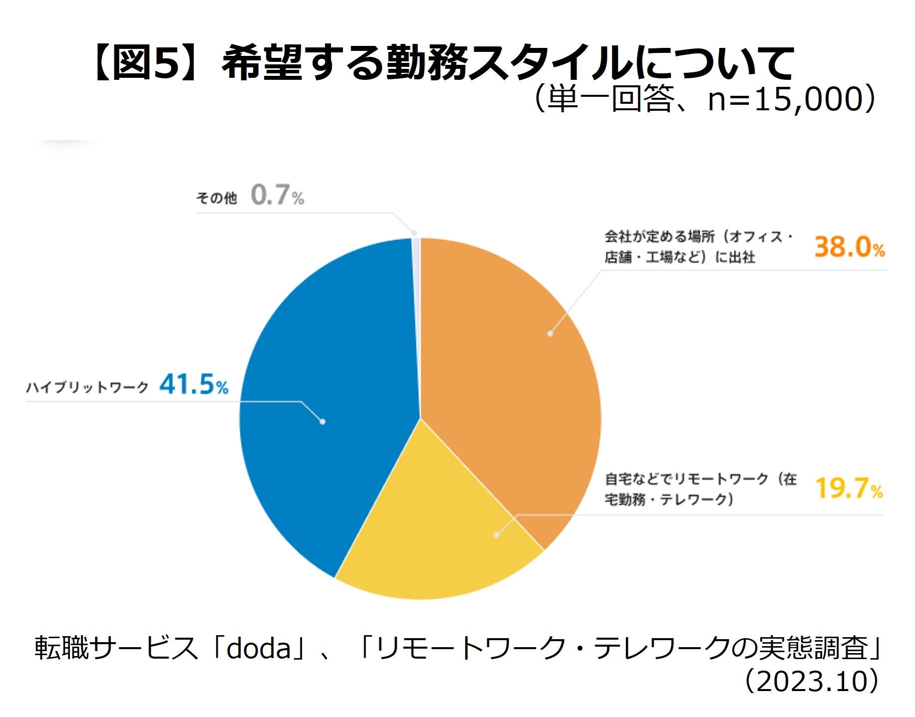 最後に、希望の勤務スタイルについて聞いてみると、「ハイブリッドワーク(リモートワークと出社の組み合わせ)(41.5%)」が最多に。「自宅などでリモートワーク(在宅勤務・テレワーク)(19.7%)」と合わせると、全体の6割強が、「リモートワークができるはたらき方」を希望していることが明らかになりました。(【図5】参照)
