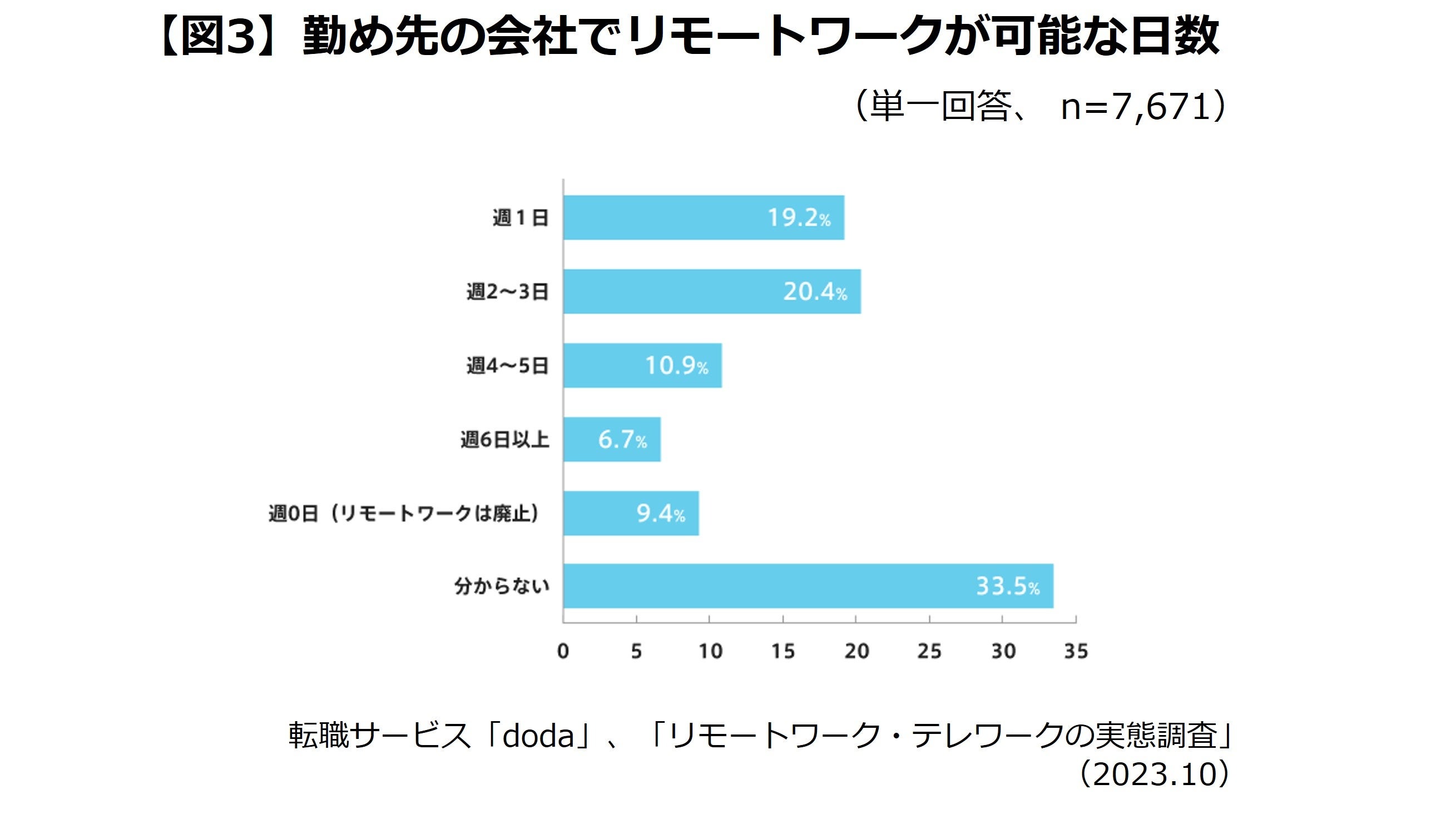 また、「週に何日リモートワークしているか」については、「週2~3日(20.4%)」と「週1日(19.2%)」が僅差となりました。(【図3】参照)