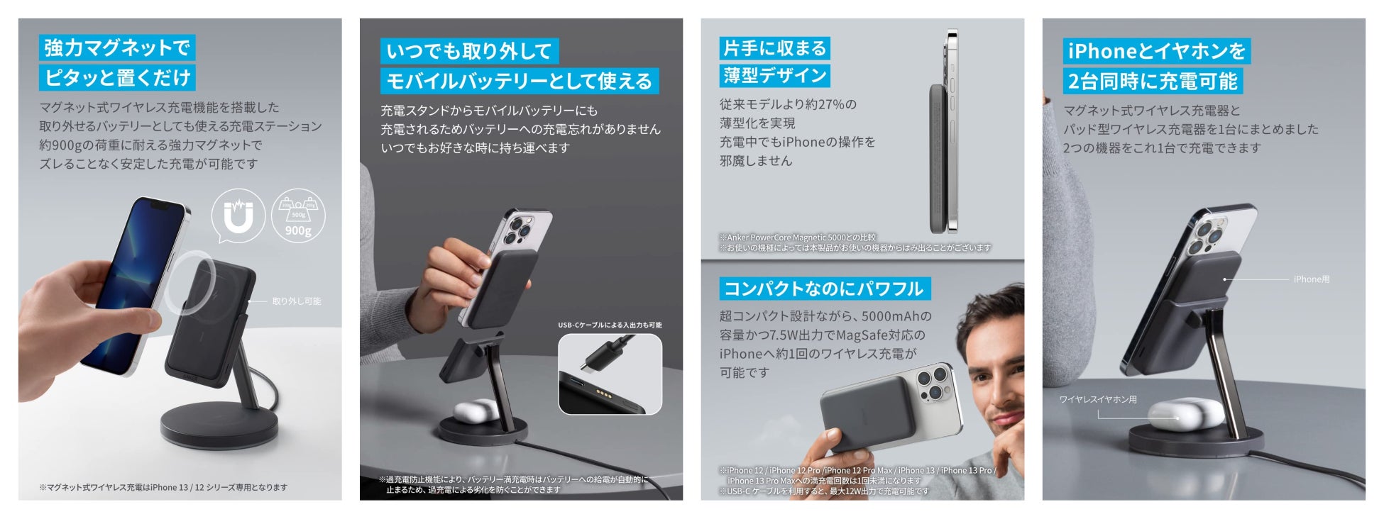 Anker MagGo(アンカー マグゴー)は、iPhone 13 / 12シリーズに強力マグネットで‘ピタッ’とくっつくモバイルバッテリーや充電ステーション、アクセサリーを含む【マグネット対応ワイヤレス充電器の製品シリーズ】です。デスクやベッドサイド、車内など日常のあらゆるシーンにおいてケーブルレスでスマートに充電できる点でご好評いただき、2021年の販売開始から全世界で累計40万台以上の販売を記録(※2022年2月末時点)致しました。