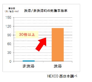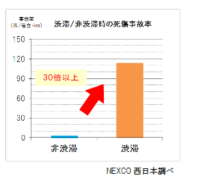 渋滞発生時の死傷事故率は、非渋滞時(渋滞していない時)の30倍以上となります。