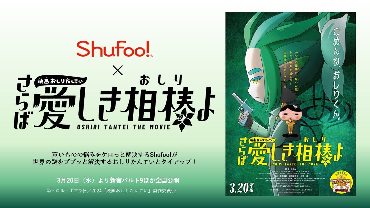 Shufoo!は、3 月 20 日より公開する注目映画『映画おしりたんてい さらば愛しき相棒(おしり)よ』とのコラボキャンペーンを実施します。今回コラボが決定したのは、2022年の『映画おしりたんてい シリアーティ』に続く、劇場版長編第2弾『映画おしりたんてい さらば愛しき相棒(おしり)よ』です。「おしりたんてい」公式および Shufoo!両方の X アカウントをフォローし、対象のキャンペーンポスト(投稿)を、リポストをすると、抽選で 5 組 10 名様に「ムビチケ前売り券(オンライン)」をプレゼントします。また、シュフーポイント会員に登録し、期間中キャンペーンに応募すると映画コミック『アニメコミックおしりたんてい 17 映画おしりたんてい さらば愛しき相棒(おしり)よ』が 10 名様に当たります。