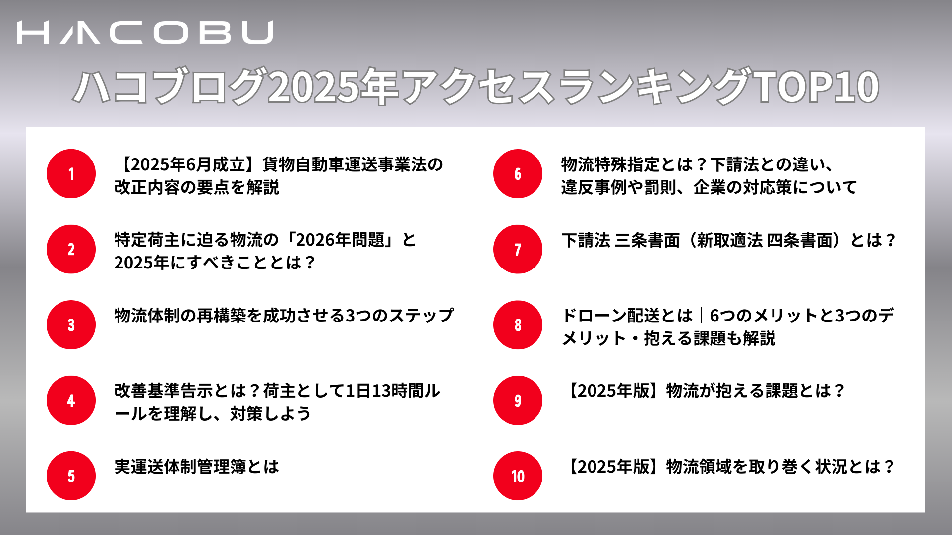 データの力で物流課題を解決する株式会社Hacobuは、運営する物流業務改善メディア「ハコブログ」における、2025年の年アクセスランキングTOP10を発表します。上位10記事のうち6記事が法規制・法改正に関連する記事となり、物流領域における法対応への関心の高さが浮き彫りになりました。