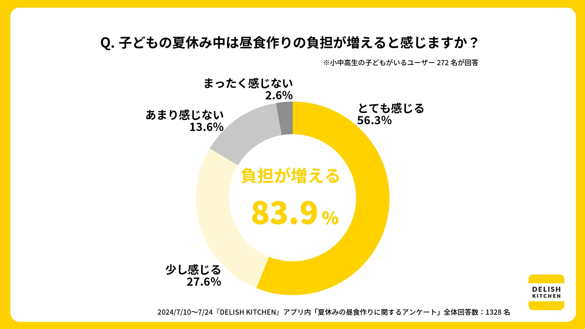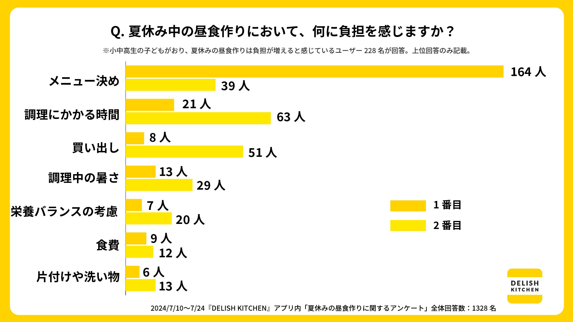『DELISH KITCHEN』のアプリで、小中高生のお子様がいるユーザー272人にアンケートを取ったところ、8割以上のユーザーが「子どもの夏休み中は昼食作りの負担が増えると感じる」と回答。さらに、何に一番負担を感じるか聞いたところ、「メニュー決め」が圧倒的に多く、次に「調理にかかる時間」「買い出し」「調理中の暑さ」などが続きました。フリーコメントでは、「仕事をフルタイムでしているので、朝にお昼も一緒に作らないといけない」「仕事しながらで時間が決まっているので、時間内に収めるのが大変」といった声もあり、家事と仕事を両方こなす現代の忙しい親世代の実情も垣間見える結果となりました。