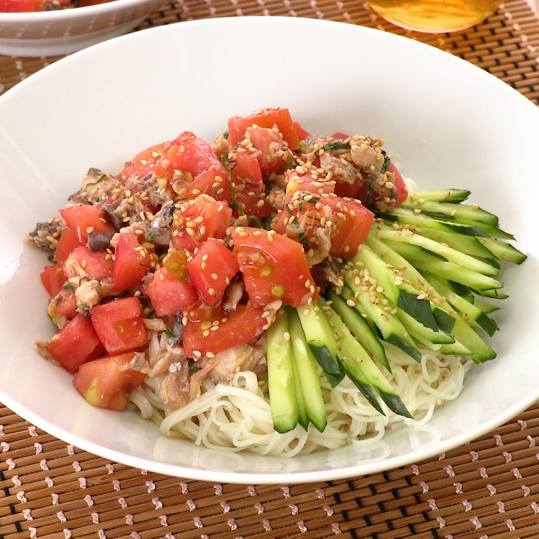 サバ缶のうま味がたっぷり詰まった一品!お酢でさっぱりといただけます。そうめんにからめてお召し上がりください♪