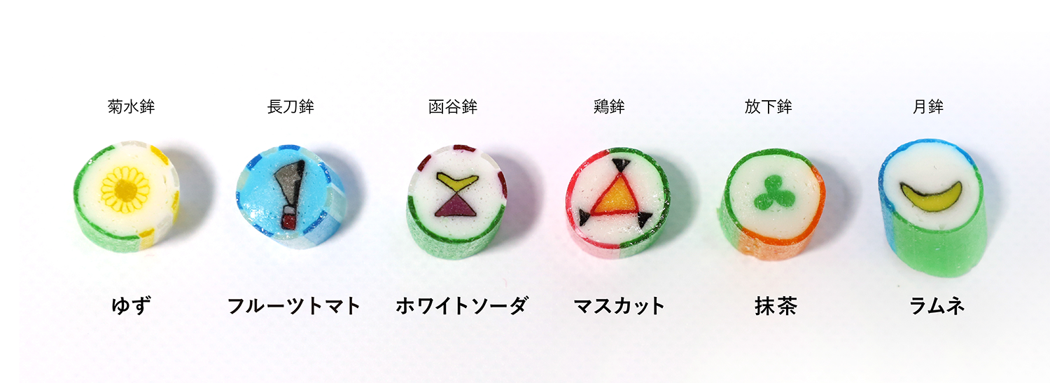 千年以上の歴史を持ち、およそ1ヶ月にわたって行われる祇園祭。それぞれに御神体が祀られ様々なご利益があると言われている鉾の中から、山鉾巡行の先頭を受け持つ「長刀鉾」や16弁の「菊水鉾」など、鉾頭を持つ6基のモチーフをキャンディで再現しました。フレーバーは爽やかな夏をイメージしたフルーツトマトやラムネなど、6柄全て限定の味で仕上げ、青空をイメージした青や榊をイメージした黄緑色を配色しています。
