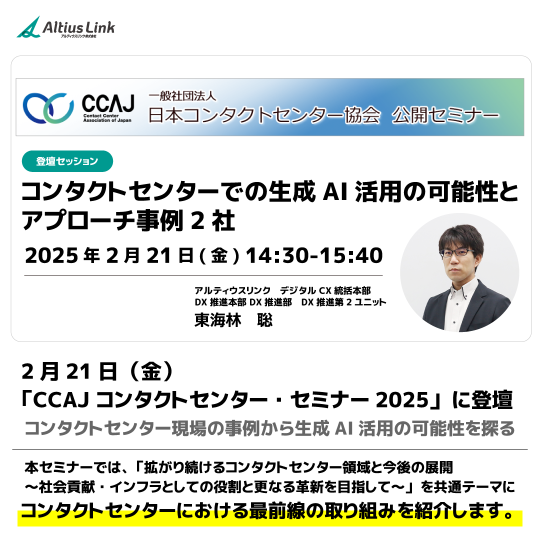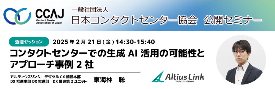 アルティウスリンク株式会社(所在地:東京都渋谷区、代表取締役社長:網野 孝、以下 アルティウスリンク)は、2025年2月21日(金)に一般社団法人日本コンタクトセンター協会が主催する「CCAJ コンタクトセンター・セミナー2025」のセッションに登壇します。
