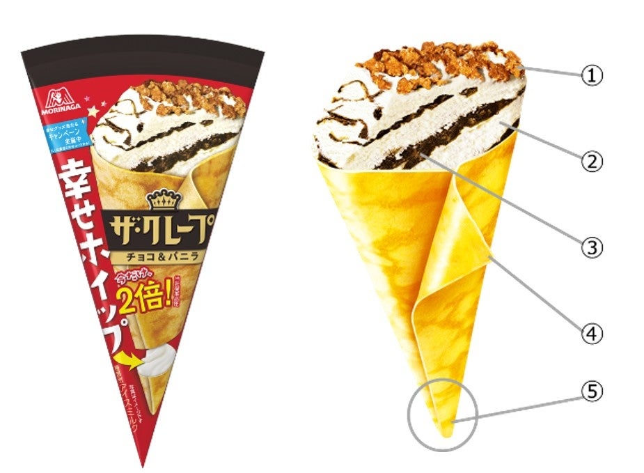 品質特長の1つであるしっぽに入っているホイップクリームは、冷凍下でも凍らない特別なもので、チルドデザートのような味わいを楽しめるこだわりの品質です。「ザ・クレープ」の前身である「クレープ屋さん」発売当時(1988年)から入っていますが、このホイップクリームの存在はあまり知られていませんでした。そこで、より多くのお客様に「このホイップの美味しさを知ってほしい」「最後の一口まで幸せを感じてほしい」という願いを込めて、このホイップを「幸せホイップ」と命名し、「幸せホイップ」の量が2倍になった『ザ・クレープ<チョコ&バニラ>幸せホイップ2倍』を2024年4月8日(月)より期間限定で発売することにいたしました。