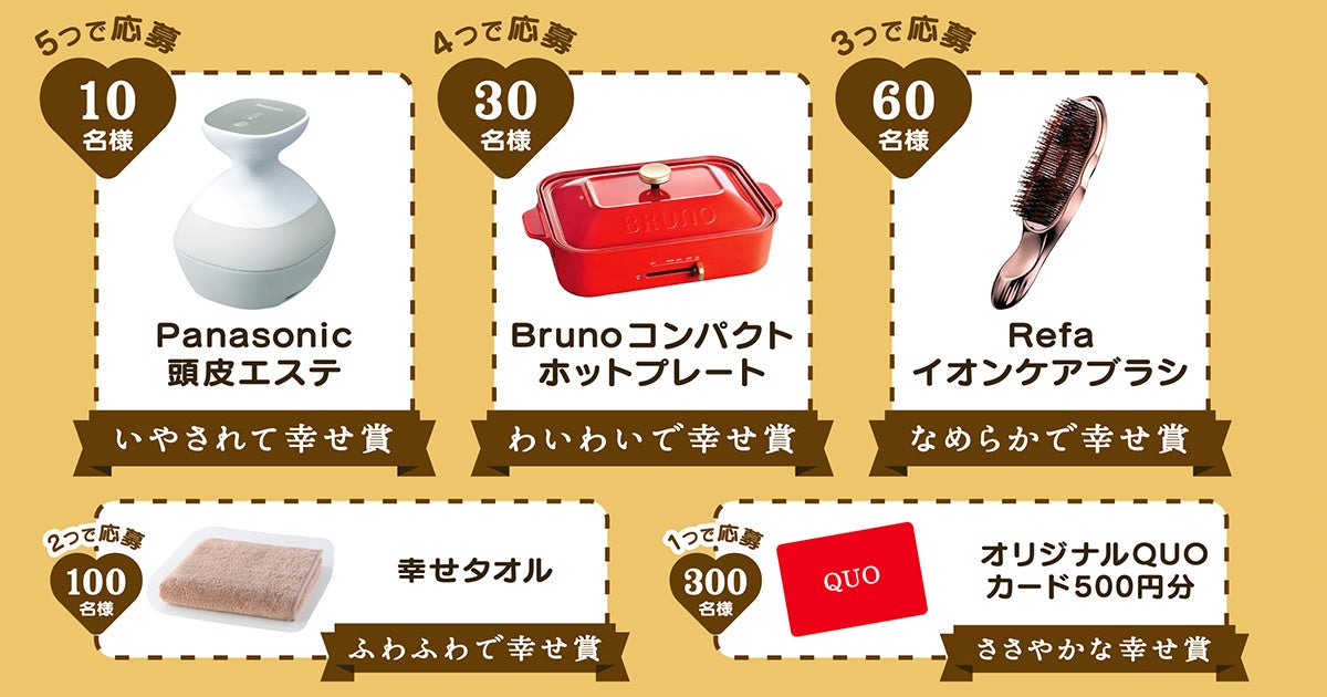 「ザ・クレープ」各種を購入したレシートで応募できるキャンペーンを開催します。対象商品の購入個数に応じてPanasonicの美容家電やRefaのヘアケア商品など、幸せグッズが合計500名様に抽選で当たります。商品を購入したレシートで特設サイトからご応募いただけます。