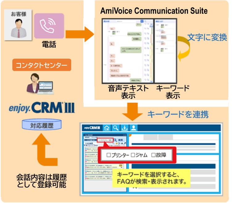 今回のシステム連携により、オペレーターとお客様の通話内容をリアルタイムで全文テキスト化できるようになります。さらに、事前に設定したキーワードの発話を通話中に認識すると、「enjoy.CRM Ⅲ」のFAQ検索機能と連携。検索したいキーワードを選択するだけで、回答案や過去の類似事例を表示します。