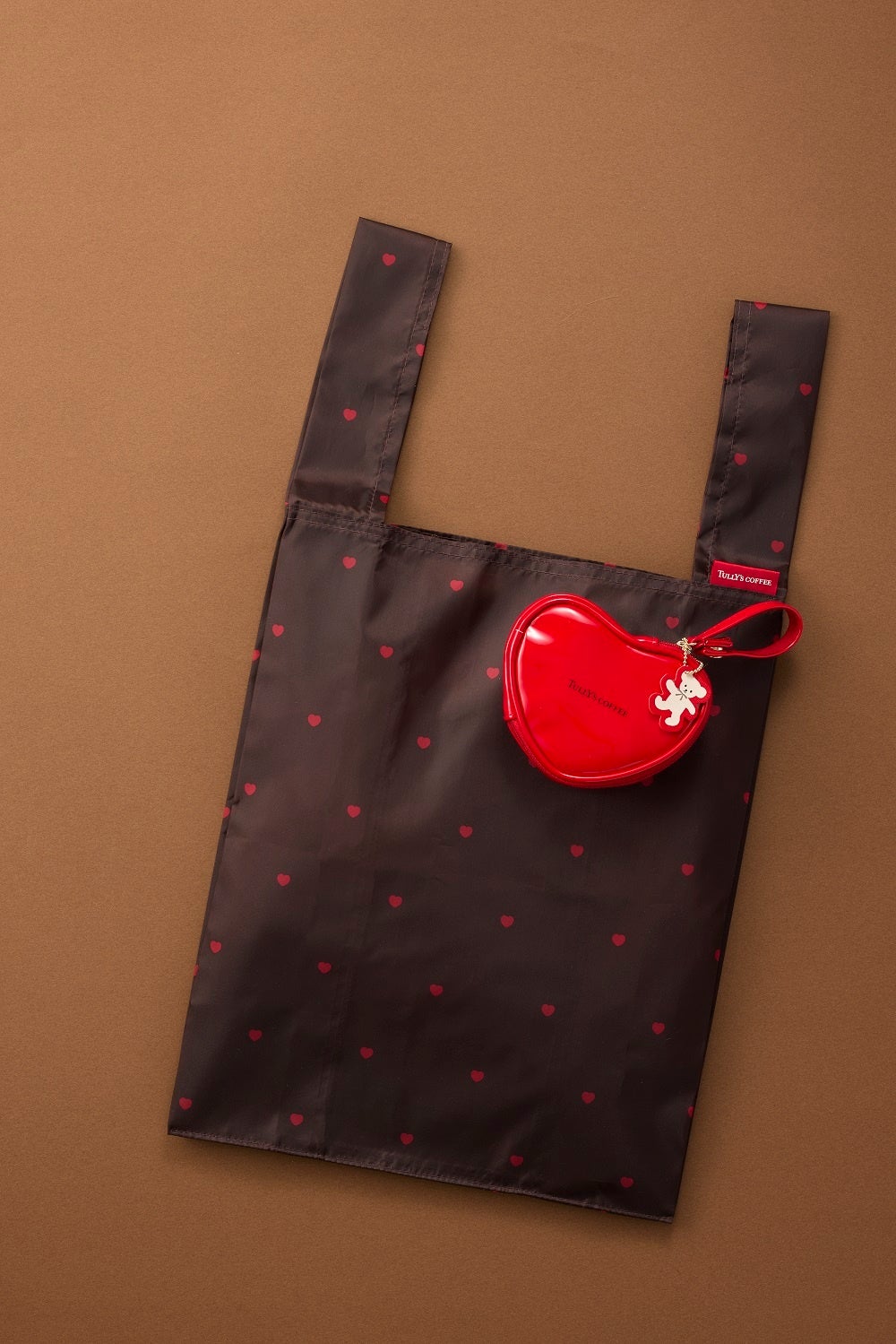 真っ赤なエナメル生地のポーチとチョコレートカラーに赤いハートを散りばめたエコバックのセット。ポーチにはベアフル®のチャームも付いています。