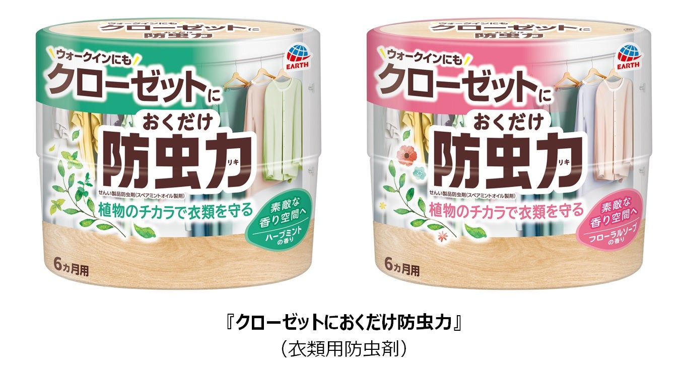 アース製薬から、植物由来の防虫成分で衣類を守る『クローゼットにおくだけ防虫力(ボウチュウリキ)』をリニューアル!防虫に加えて、衣類も収納空間もまるごと消臭