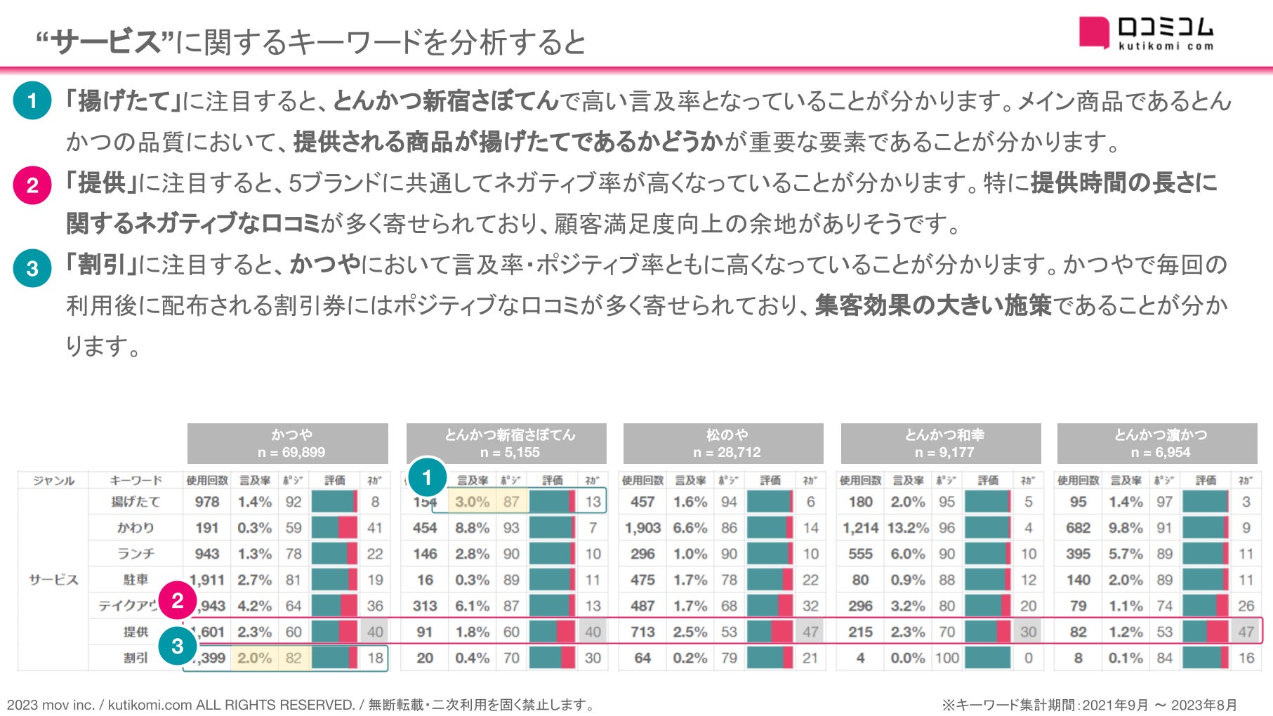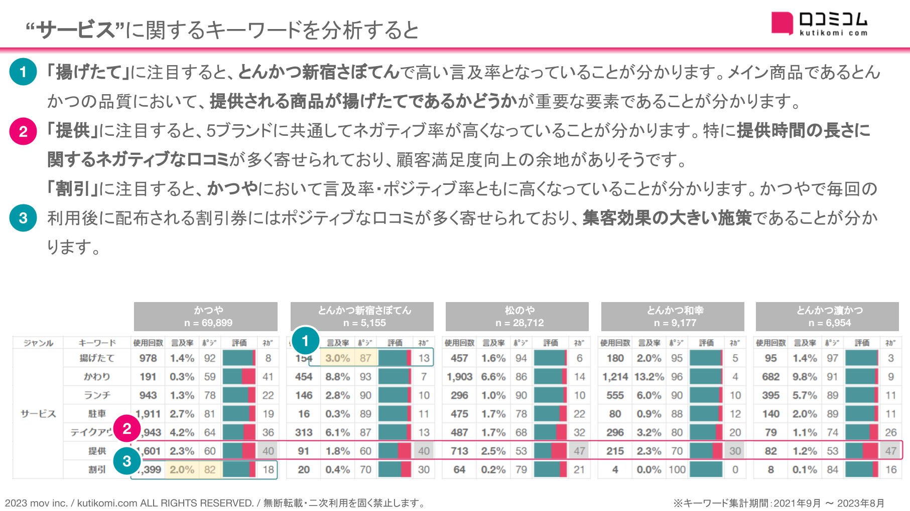 「割引」に注目すると、かつやにおいて言及率・ポジティブ率ともに高くなっていることが分かります。かつやで毎回の利用後に配布される割引券にはポジティブな口コミが多く寄せられており、集客効果の大きい施策であることが分かります。