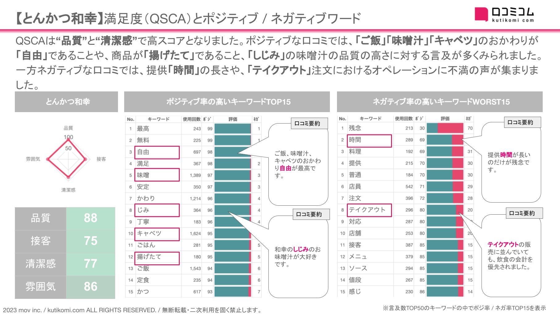今回は、このAI解析を用いて【和幸】 のQSCA・ポジ / ネガキーワードを確認しました。