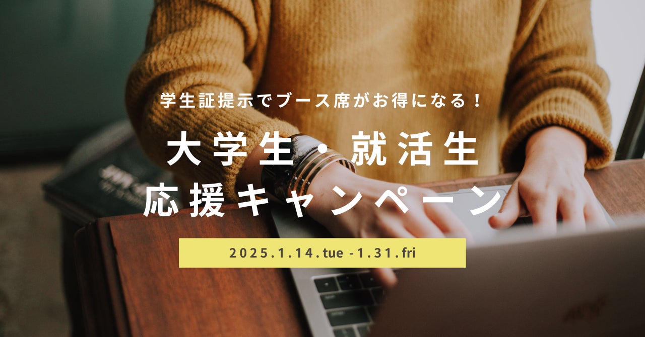 期間中、学生証をご提示で1名ブース席がフリースペース価格で毎日(平日限定)お得に使える大学生限定のキャンペーンです。