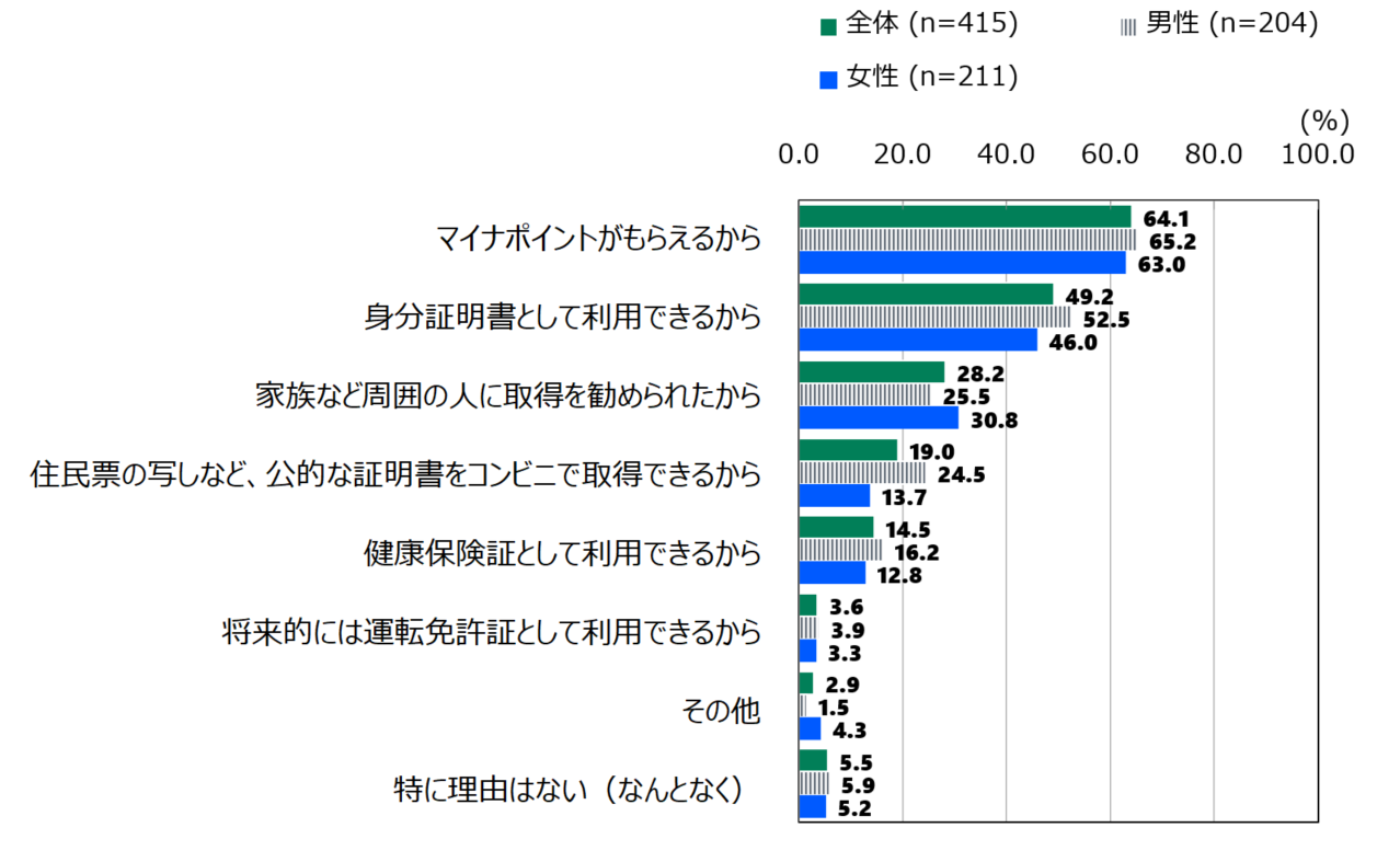 マイナポイントがもらえるから 64.1% 身分証明書として利用できるから 49.2%