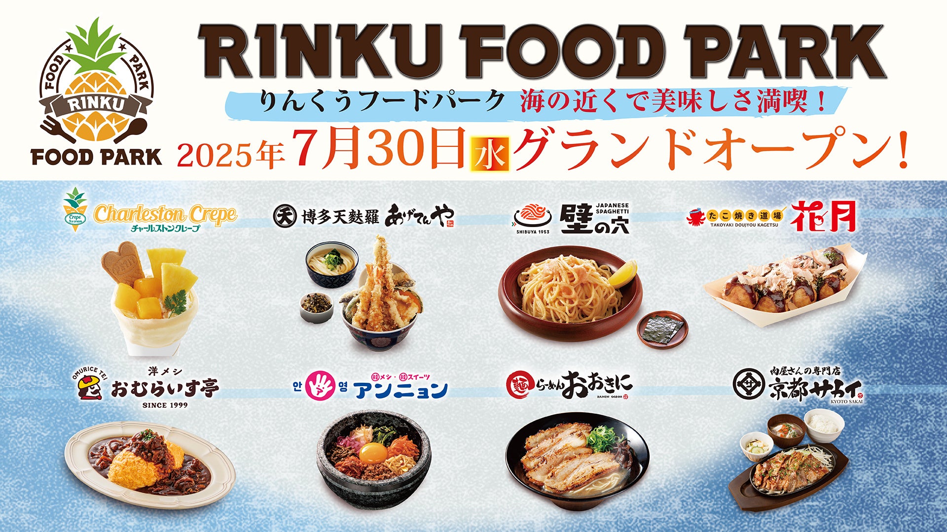 りんくうプレミアム・アウトレット内にございますフードコート「ワールドグルメジャンクション」はこの度、開業25周年の記念イヤーに全面リニューアルを行い「RINKU FOOD PARK(りんくうフードパーク)」として7月30日(水)にグランドオープンいたします。スイーツ、スパゲッティ、オムライス、豚骨醤油ラーメンなど8種類の食のブランドをご用意いたします。海の近くで、爽やかな空気と共にお食事をお楽しみください。皆さまのご来店をスタッフ一同お待ちしております。何卒宜しくお願い致します。