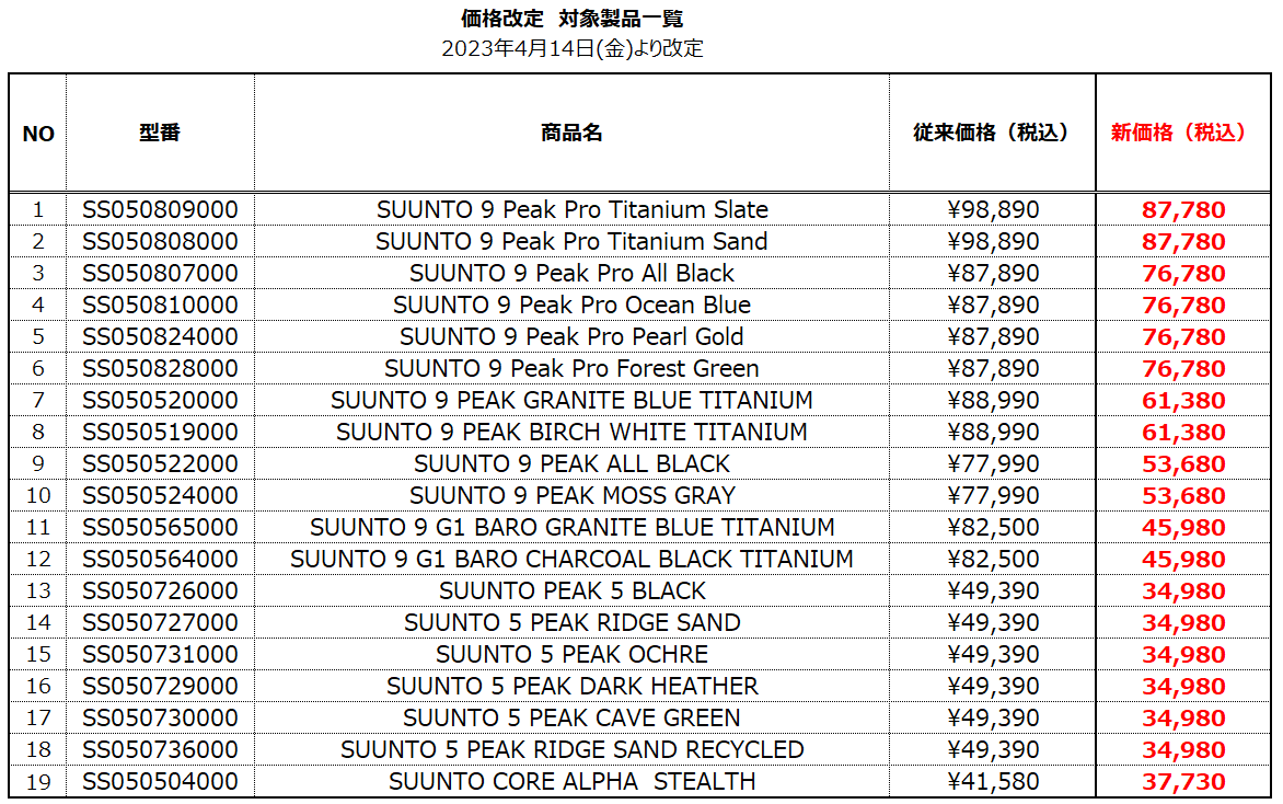 SUUNTO(スント)ブランドは、今後もより良い製品・サービスを適正な価格でお客様にお届けできるよう努めてまいります。何卒ご理解とご協力を賜りますよう、お願い申し上げます。