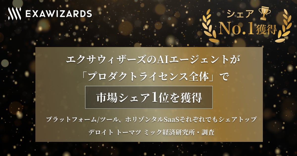 株式会社エクサウィザーズ(東京都港区、代表取締役社長CEO:春田 真、以下エクサウィザーズ)は、当社のAIエージェントプラットフォームおよびプロダクトが、デロイト トーマツ ミック経済研究所の調査において、市場シェア1位となったことをお知らせします。同社のAIエージェント ソリューションサービスの市場動向調査*1における「プロダクトライセンス全体」、その内訳である「プラットフォーム/ツール」「ホリゾンタルSaaS」においてもそれぞれ市場シェア1位を獲得しています。当社は、これまでに日本企業の業務自動化による生産性向上を目指しAIプロダクト・サービスを提供してきており、その成果と考えております。