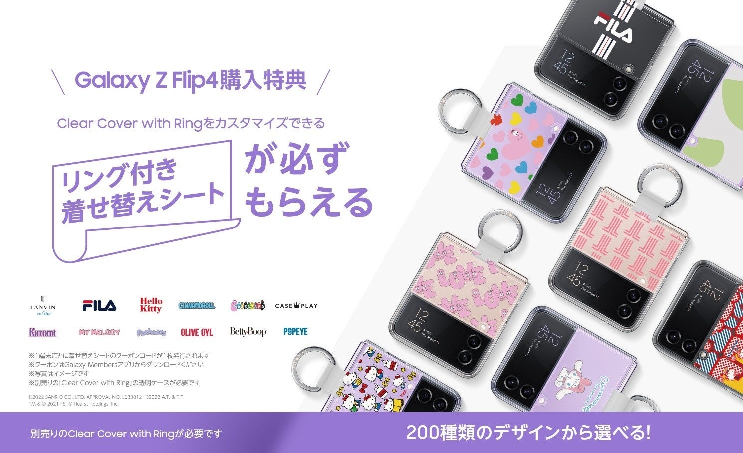 対象期間中に「Galaxy Z Flip4」をご購入いただいたお客様全員に、「リング付き着せ替えシート for Galaxy Z Flip4」1枚が貰えるクーポンをプレゼントするキャンペーンを実施いたします。※「Clear Cover with Ring」は別売りとなります。