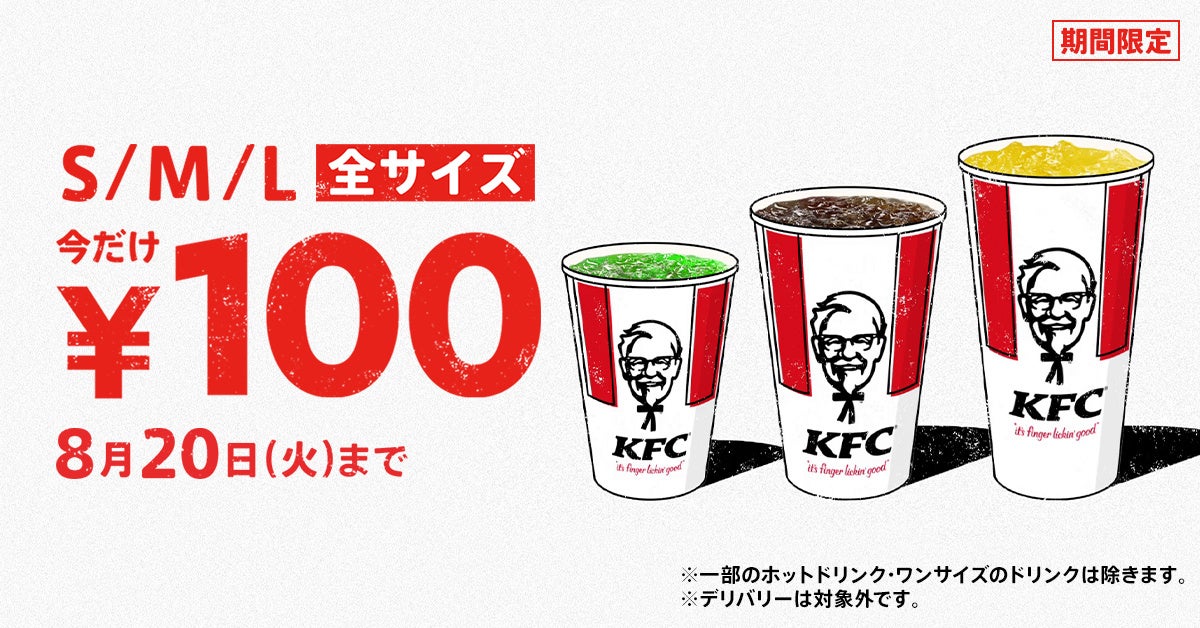 日本ケンタッキー・フライド・チキン株式会社は、全国のケンタッキーフライドチキン(以下:KFC)店舗で、「ドリンク全サイズ100円」キャンペーンを、8月7日(水)から8月20日(火)の2週間実施します。
