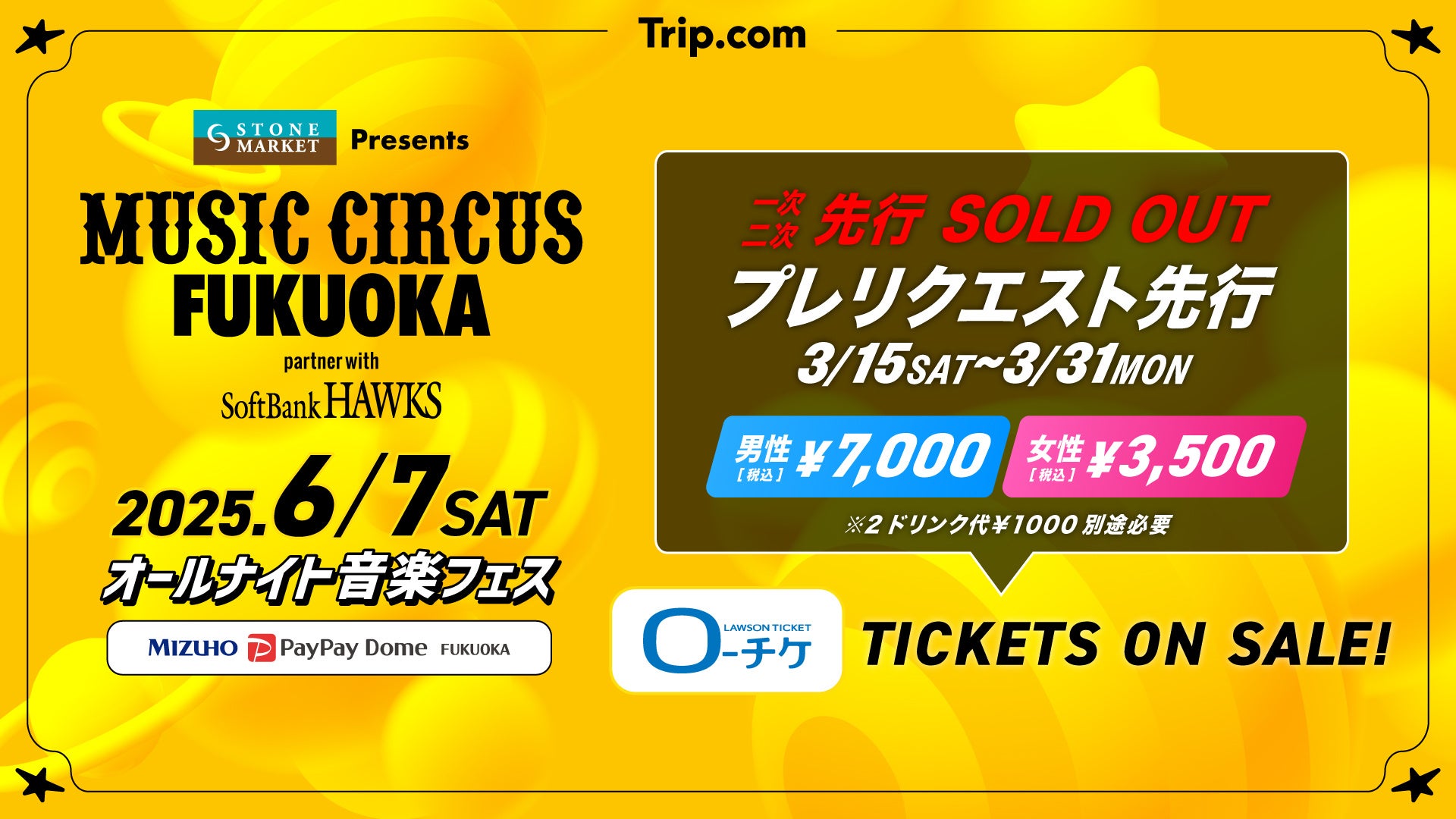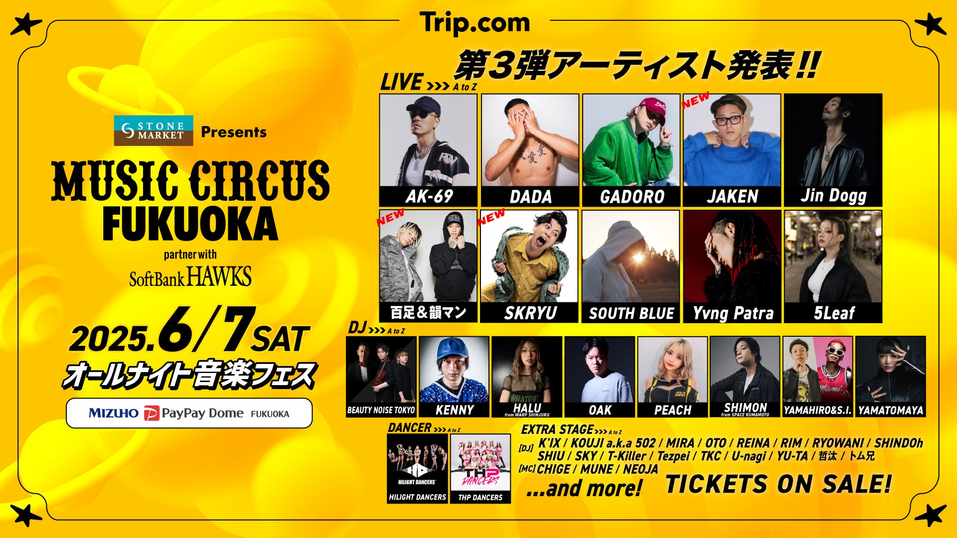 株式会社TryHard Japan(大阪市中央区)は、2025年6月7日(土)にみずほPayPayドーム福岡で開催されるオールナイト音楽フェス「STONE MARKET Presents MUSIC CIRCUS FUKUOKA partner with SoftBank HAWKS」の第3弾出演アーティストを発表いたします。