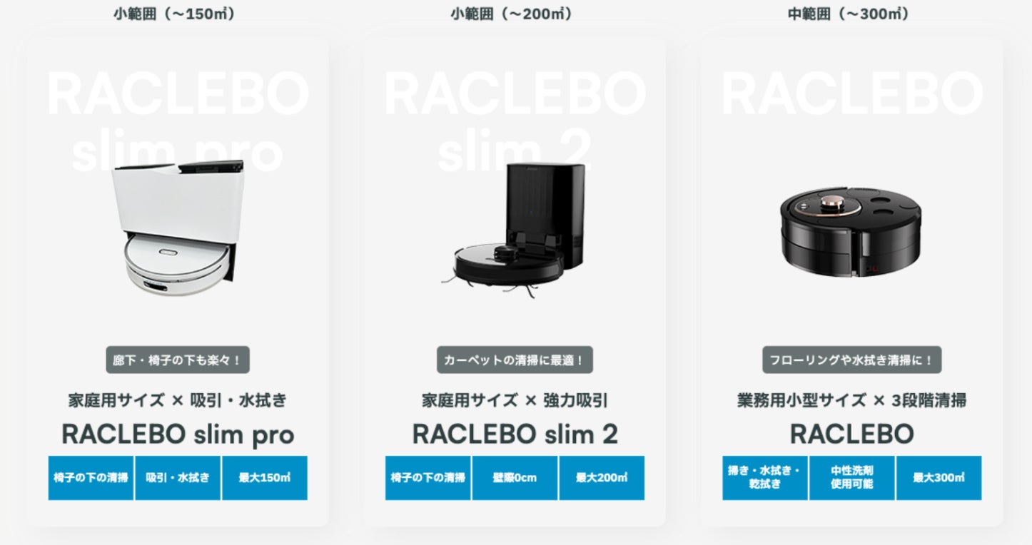 当日の見どころは、当社オリジナルの業務用小型清掃ロボット、RACLEBO(ラクリボ)シリーズの実演展示です。油汚れに対応する水拭き機能や、フローリングからカーペットまで複数の床材に1台で対応できる機能など、現場ニーズに合わせて複数機種をご紹介。カタログや数値だけでは伝わりにくい、清掃力や動き、サイズ感を直接お確かめいただけます。