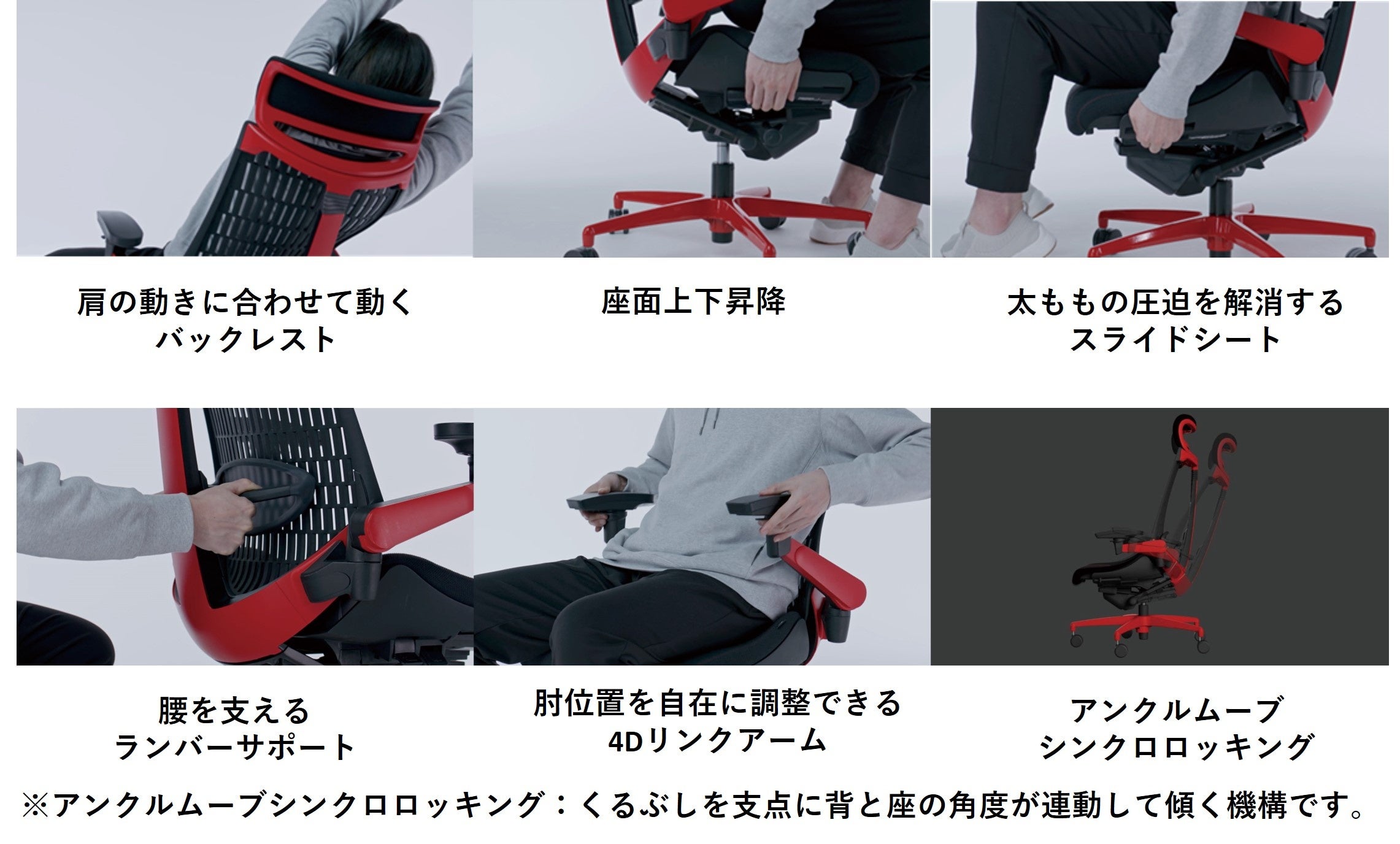 Act Gamingは、オフィス向けの「Actチェア」(2018年11月発売)をベースにエスクトリームプレイヤー用に改良開発された製品です。背もたれはサイドフレームをなくしたことでスマートなデザインに、また肩の動きに合わせて動く構造や肘位置を調整できる4Dアームなどの特徴的な機能をベースに、靴を履かない家庭での使用を考え座面の高さを低く設定しています。