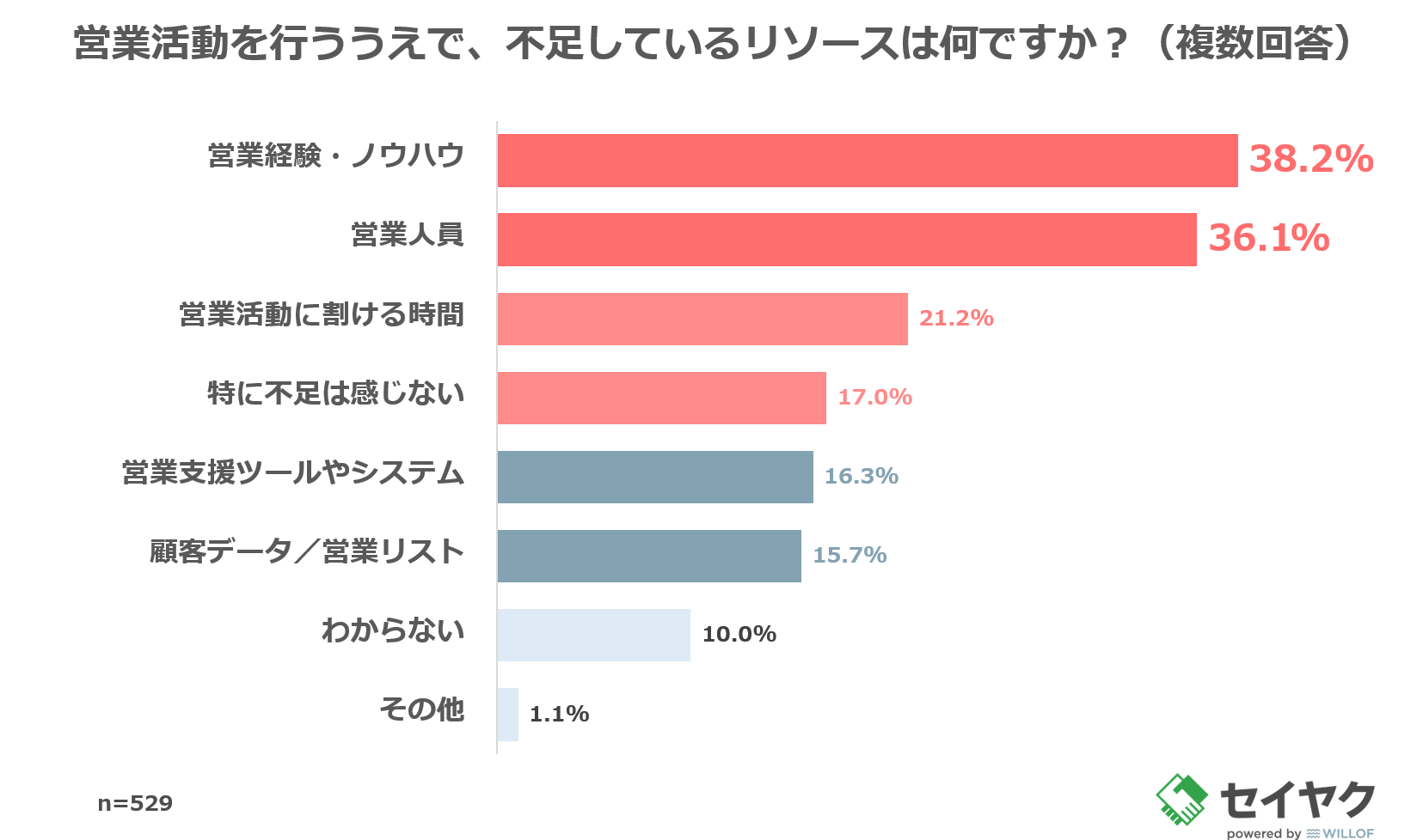 また、【営業活動を行ううえで不足しているリソースは何か(複数回答)】について聞いたところ、「営業経験・ノウハウ(38.2%)」という回答が最多となりました。次いで「営業人員(36.1%)」、「営業活動に割ける時間(21.2%)」という結果となりました。単に人手不足だけでなく、営業に関する経験や知見の蓄積が十分ではない、と感じている人が多いということがわかります。