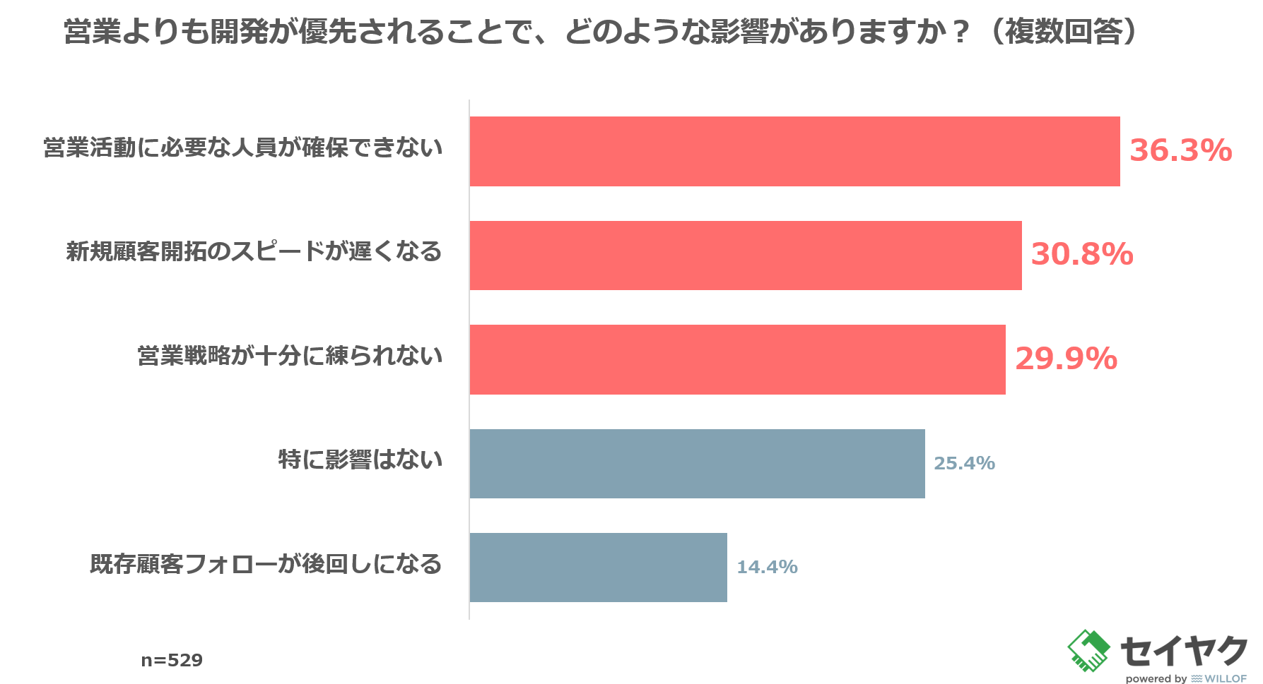 さらに、「開発が優先されている」と答えた人を対象に【営業よりも開発が優先されることでどんな影響があると思うか】について聞いたところ、「営業活動に必要な人員が確保できない(36.3%)」が最も多い結果となりました。次いで「新規顧客開拓のスピードが遅くなる(30.8%)」「営業戦略が十分に練られない(29.9%)」といった影響があることが分かりました。