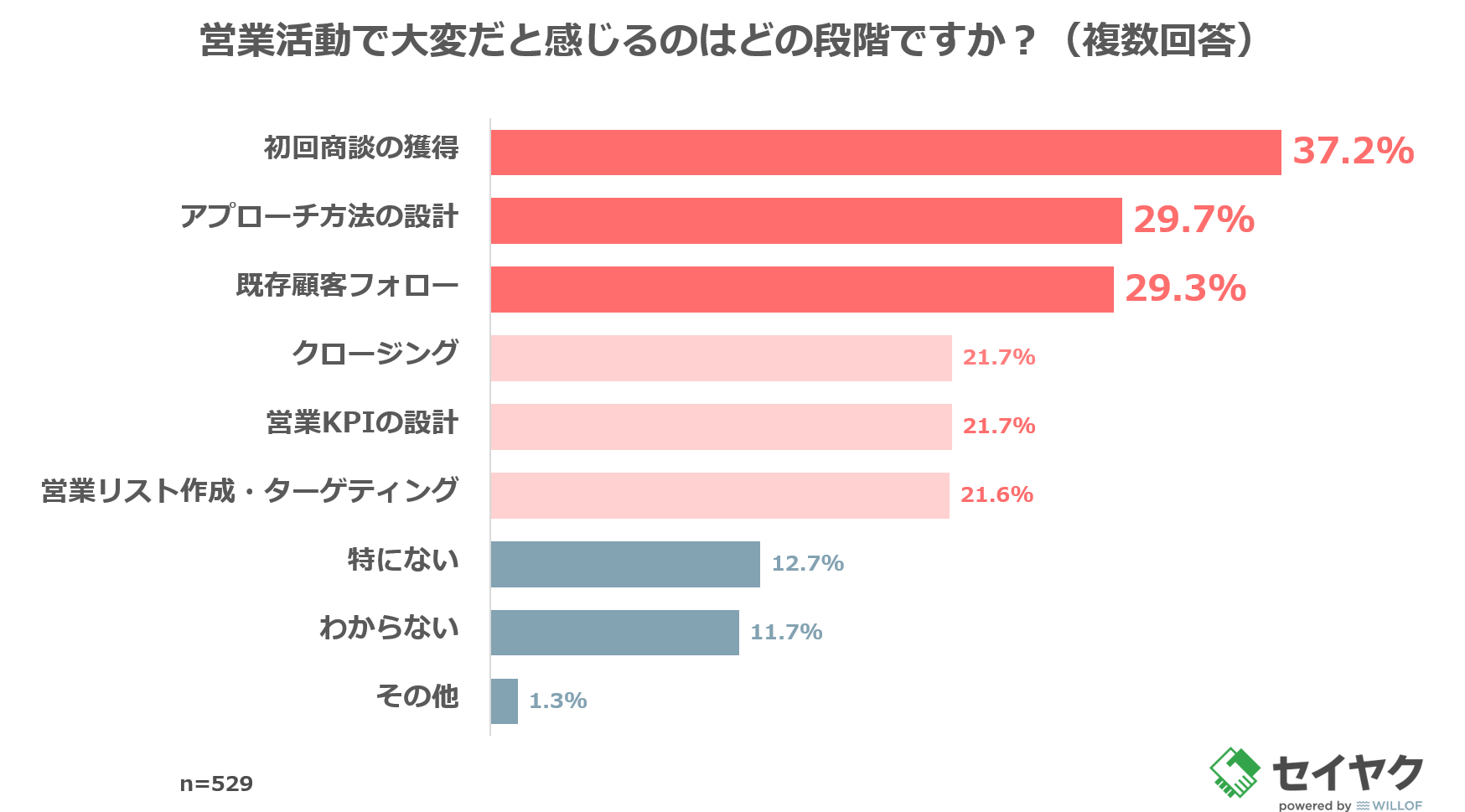 【営業活動において最も大変だと感じるのはどの段階か】について聞いたところ、「初回商談の獲得(37.2%)」という回答が最多となりました。次いで「アプローチ方法の設計(29.7%)」「既存顧客フォロー(29.3%)」という結果になりました。初回商談の獲得が課題と感じる割合が高いことから、見込み顧客の発掘やアポイント獲得の段階で苦戦する傾向があることがわかりました。