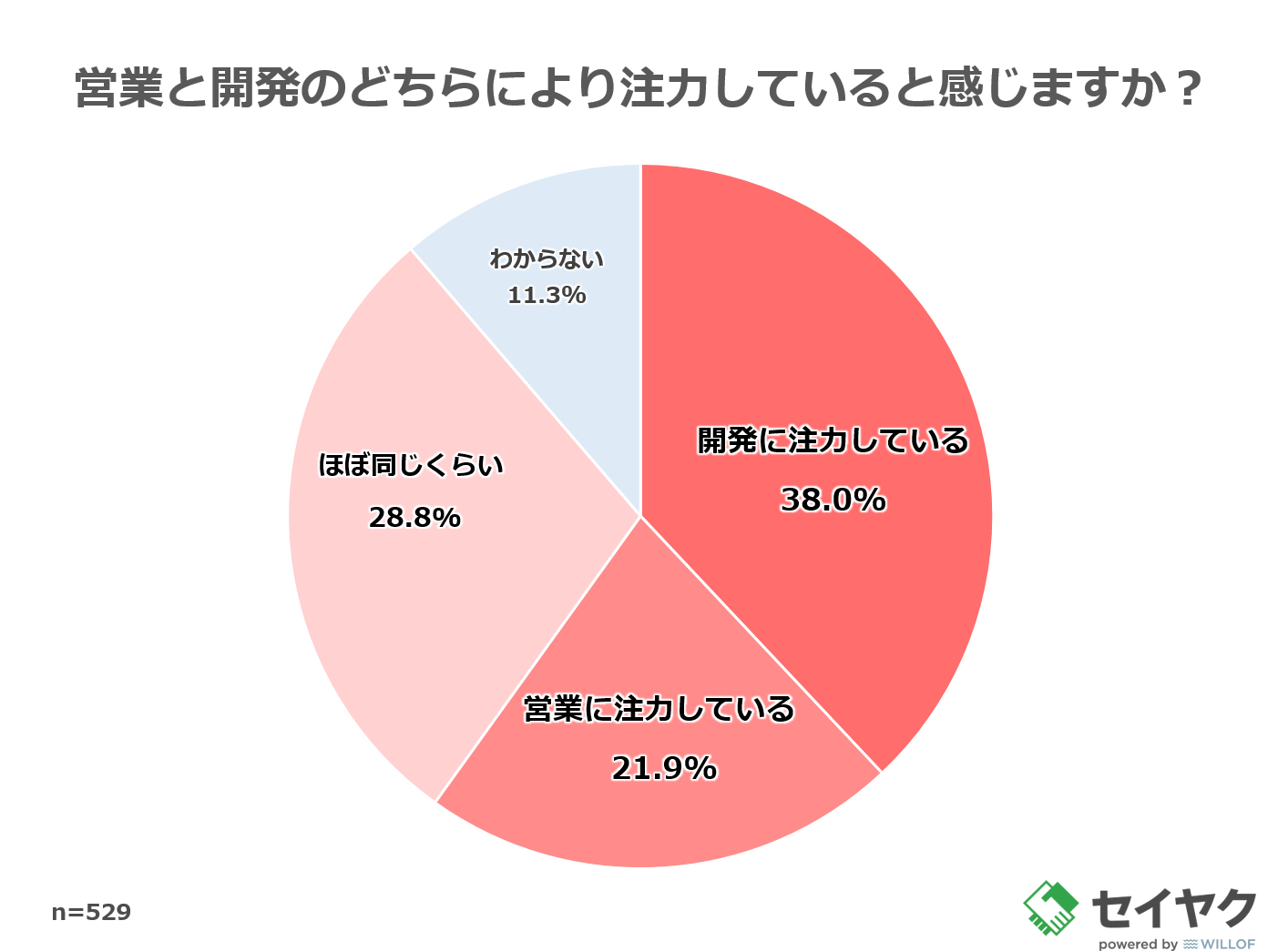 【あなたの会社では営業と開発のどちらにより注力していると感じるか】について聞いたところ、「開発に注力している(38.0%)」 「営業に注力している(21.9%)」の結果となりました。「ほぼ同じくらい」と回答した割合は28.8%で、両立を図っている企業も一定数見られますが、「開発に注力している」と感じる割合がやや多い結果となりました。