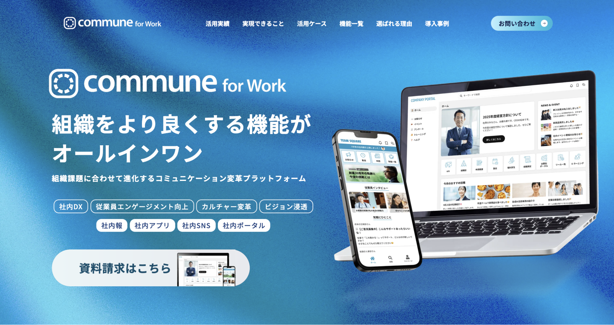 「Commune for Work」は、「社内SNS」「社内ポータル」「社内報」の機能を搭載し、組織課題に合わせて進化するAll-In-One型コミュニケーションプラットフォームです。