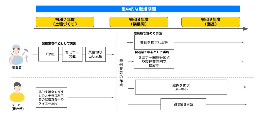 令和7年度においては、製造業の事業所に対してニーズ調査やセミナー、業務の切り出し支援を実施し、中間的な成果を取りまとめていきます。また、市民に対しては就労支援施設や女性しごとテラスを中心に支援を行っていきます。