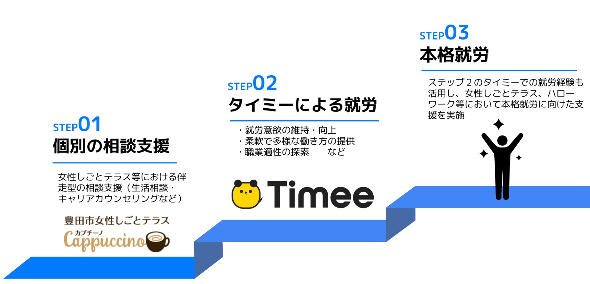 本協定では、この窓口の利用者に対して、就業までの敷居が低いタイミーを案内し、潜在労働力を喚起していくとともに、タイミーを長期就労に向けたスモールステップ支援として活用していきます。