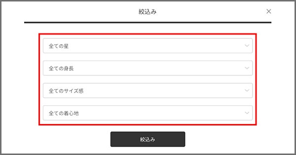 「星の数」「サイズ感」「着心地」などの評価項目や「身長」「普段の足のサイズ」といったレビュアーのパーソナルデータを軸としたレビューの絞り込み機能を実装し、各ユーザーの購入条件と関連性が高い投稿を表示することが可能となりました。