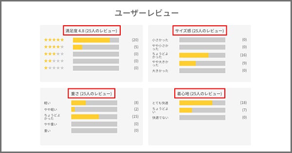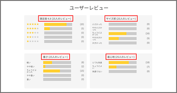 さらに商品評価をグラフで可視化することにより、視覚的にも分かりやすくレビュー情報を表示しています。
