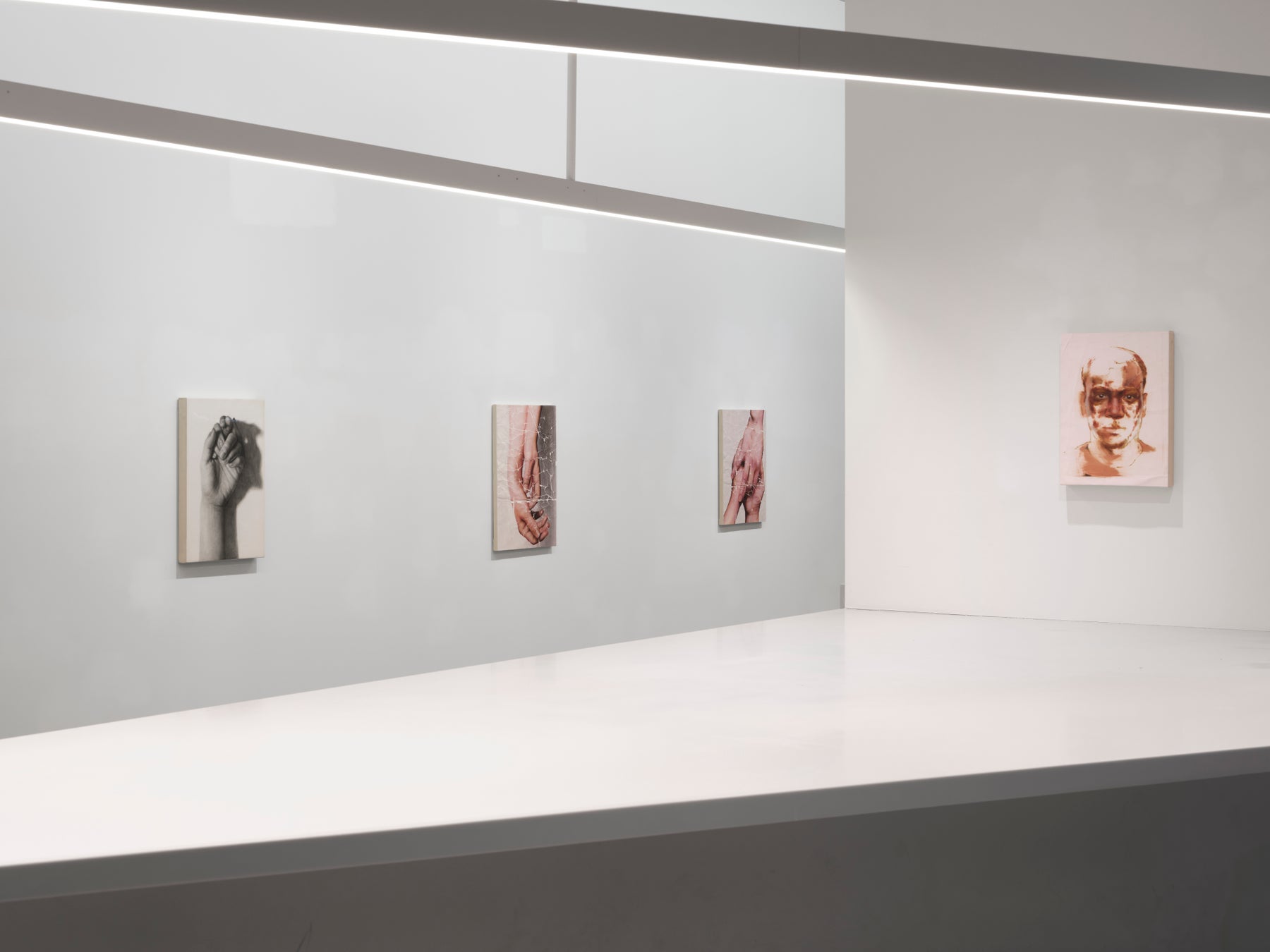 展示タイトル「document / skin」は、皮膚を単なる生体組織としてではなく、経験や外部との接触が蓄積される「記録媒体(ドキュメント)」として捉える姿勢を示している。また、「手」や「パスポート写真」、「幼児」といったモチーフは、皮膚を「触れる・触れられる」や「見る・見られる」という関係が交錯する表面と捉え、コロナ禍以降、反復的に用いてきたものである。これらは、原初的な接触への希求と、社会制度による身体の管理という、皮膚をめぐる二極的な側面を象徴している。