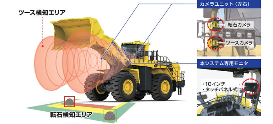 今回コマツ様の大型ホイールローダー用自動検知支援システムでは、ツース脱落や車両近くの転石をAIによる画像解析を用いて自動検知することができます。