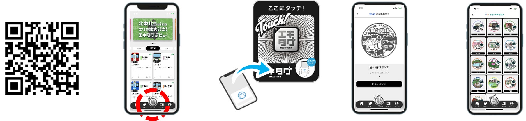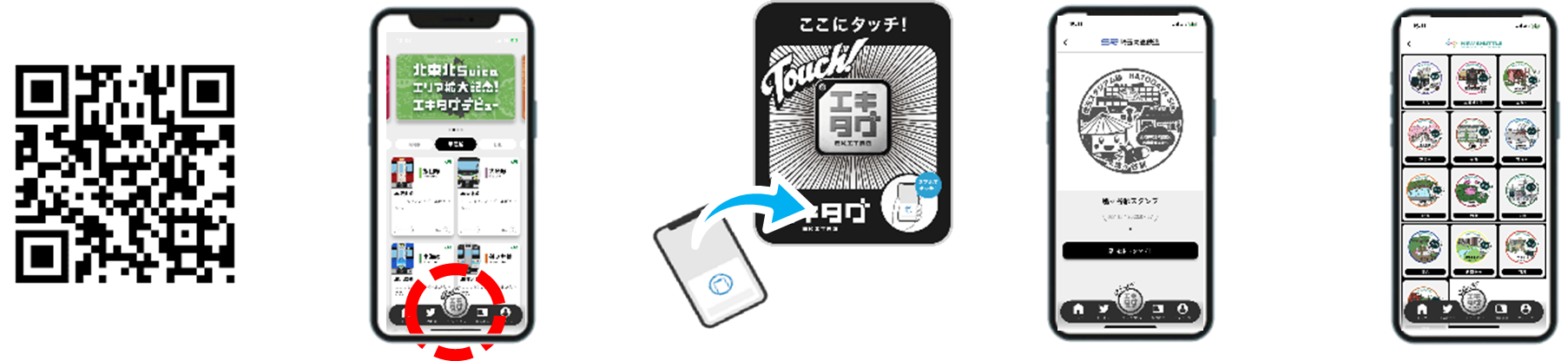1.アプリを 2.「タッチする」 3.「エキタグ」に 4.「デジタル駅 5.スタンプ帳