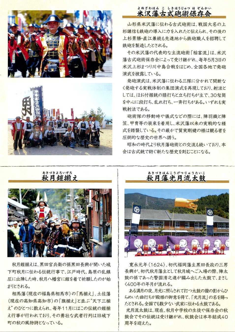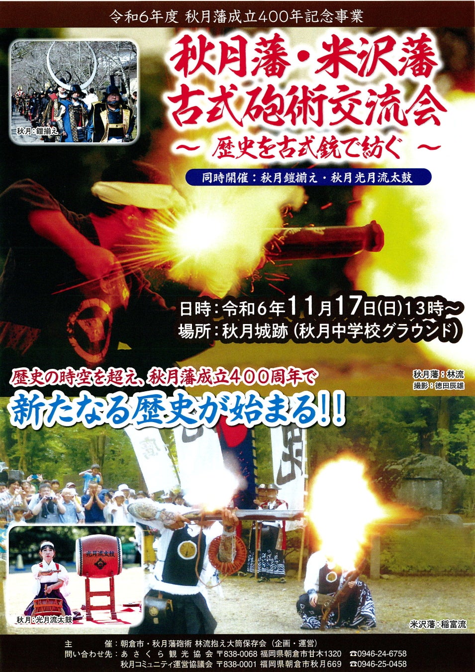 令和6年の秋月藩成立400年記念事業として、山形県米沢市の米沢藩古式砲術隊を招聘し、メイン事業として秋月城跡にて秋月藩と米沢藩の古式砲術会の演武を、あわせて光月流太鼓の披露、そして秋月鎧揃えを同日開催する。秋月藩所縁(ゆかり)の伝統文化が結集し、歴史・情緒ある城跡に多くの来訪者を誘う。