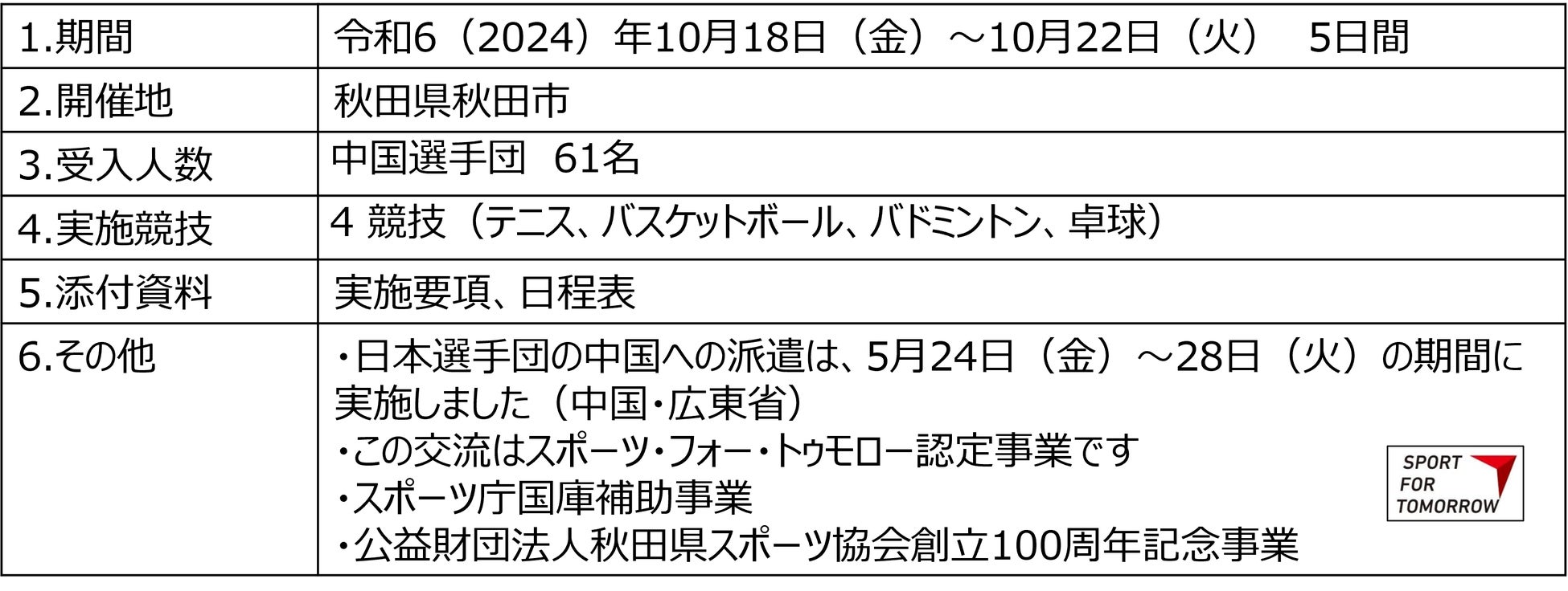スポーツを「する」「みる」「ささえる」ための環境づくりを行うJSPO(正式名称:公益財団法人日本スポーツ協会 東京都新宿区/会長 遠藤 利明)は、来る10月18日(金)~22日(火)に秋田県にて、中国選手団を迎えて標記交流を実施します。