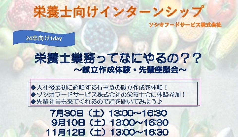 ソシオフードサービス株式会社(東京都港区、社長執行役員:丸山忠和)は7月・9月・11月、2024年卒業予定の学生を対象に「栄養士向けインターンシップ『栄養士業務ってなにやるの??~献立作成体験・先輩座談会~」を開催します。