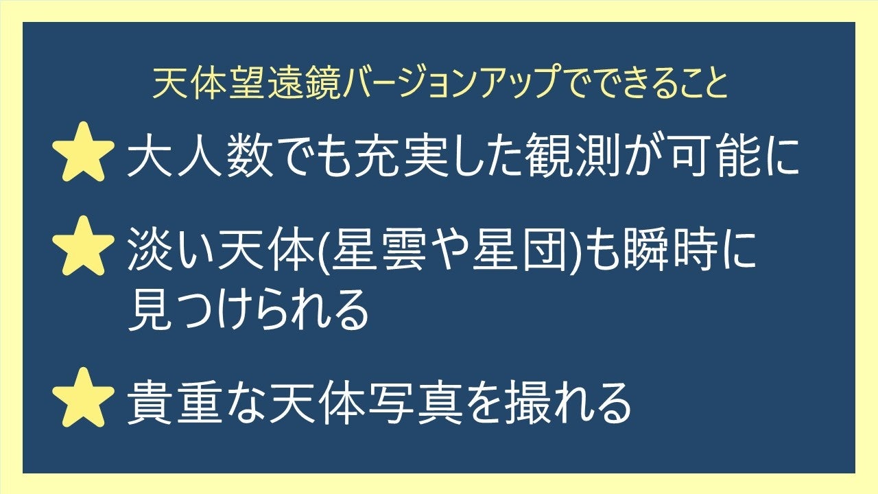 この機能の更新とコンピュータ制御で天体を見つける装置の新たな追加で、綺麗な星空をもっと楽しんでもらいたい!