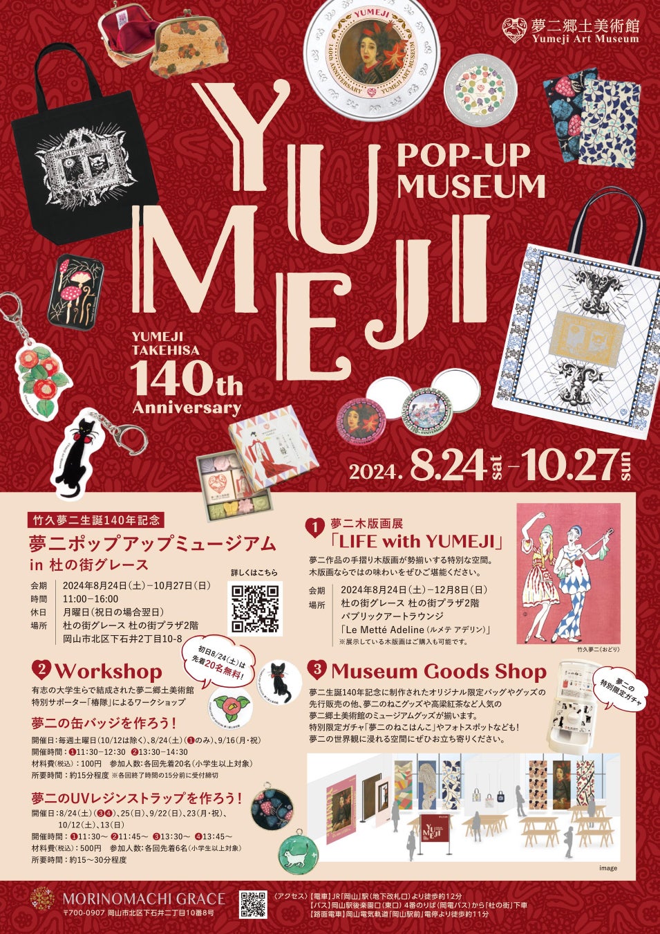 夢二郷土美術館(所在地:岡山県岡山市中区浜2-1-32、館長:小嶋光信、運営:公益財団法人両備文化振興財団|https://yumeji-art-museum.com/ )では、竹久夢二生誕140年を記念した全国巡回記念展覧会「生誕140年 YUMEJI展 大正浪漫と新しい世界」を9月7日(土)より開催することに先駆け、8月24日(土)から10月27日(日)まで杜の街グレース 杜の街プラザ2階(岡山市北区下石井2丁目 10-8)にて夢二生誕140年を祝した初の「YUMEJI POP-UP MUSEUM(夢二ポップアップミュージアム)」を開催いたします。