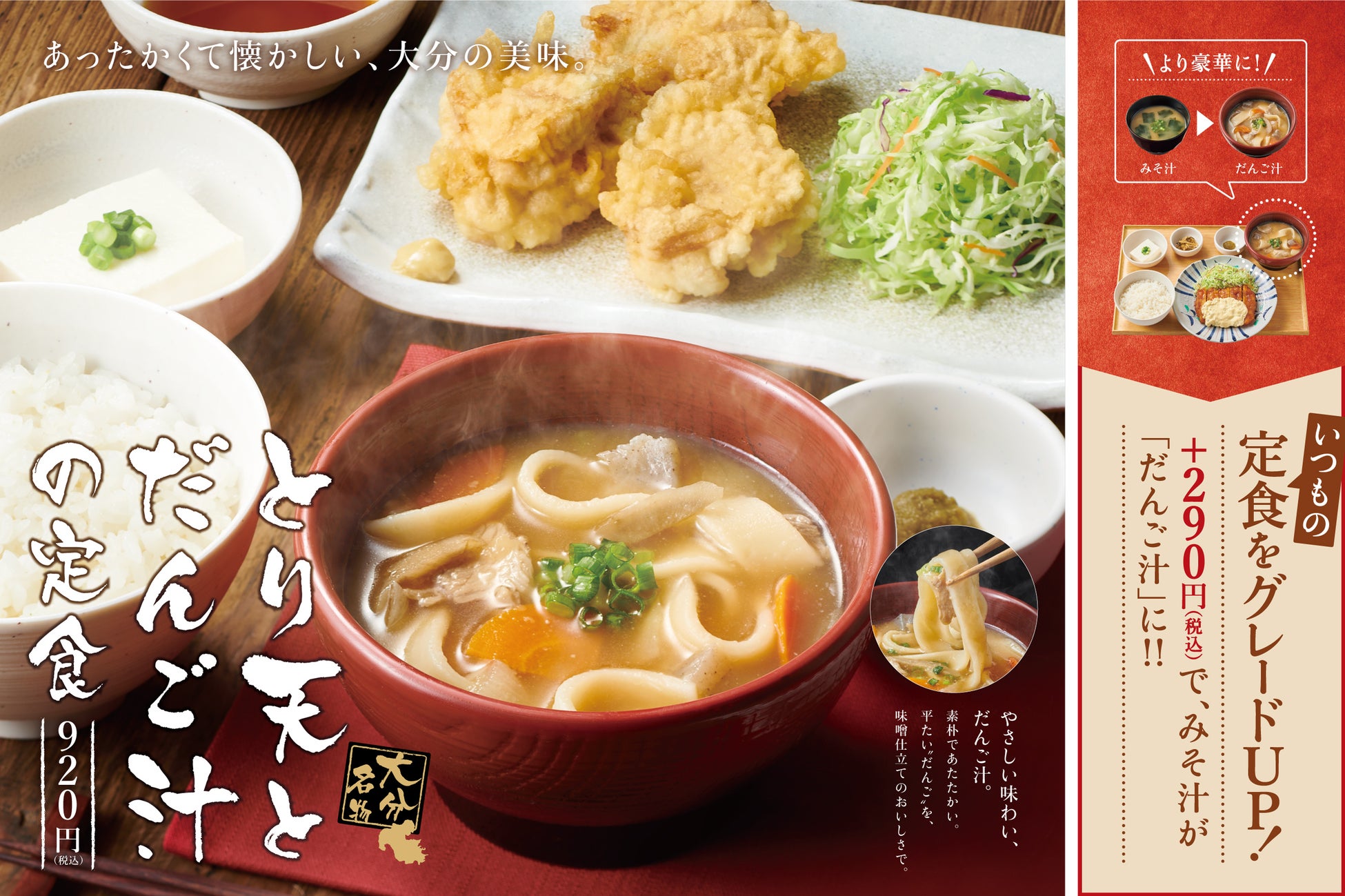 「やよい軒」大分名物が「やよい軒」で登場!サクサクのとり天と、優しさ感じる味噌仕立てのだんご汁を定食に!『とり天とだんご汁の定食』3月2日(木)新発売
